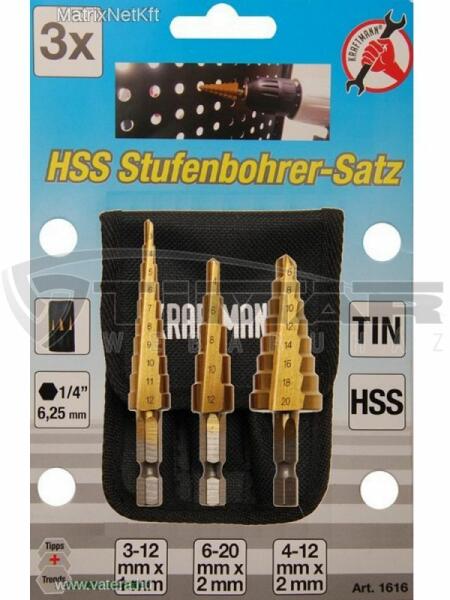 Angol nyelvű leírás (a magyar fordítást lásd lejjebb):titanium coatedwith practical storage caseScope of delivery:HSS step drill, size 1: 3 - 12 mm, 1 mm stepsHSS step drill, size 2: 6 - 20 mm, 2 mm stepsHSS step drill, size 3: 4 - 12 mm, 2 mm stepsMagyar fordítás (fordító automata segítségével):titán bevonatúgyakorlati tárolóvalSzállítási terjedelem:HSS lépcsős fúró, méret 1: 3 - 12 mm, 1 mm-es lépcsőkHSS lépcsős fúró, méret 2: 6 - 20 mm, 2 mm-es lépésekHSS lépcsős fúró, méret 3: 4 - 12 mm, 2 mm-es lépésekA Kraftmann termékeinket szintén a német BGS Technic® gyártócég állítja elő, árban azonban még kedvezőbb alternatívát jelent a szerszámpiacon. A BGS Technic® márka az 1970 évi első gyártás óta Németországban és több, mint 80 országban világszerte kiváló minőséget, valamint az innovatív újdonságok sokaságát fémjelzi és kiváló hírnévnek örvend vevőink körében. A termékválasztékunkban csúcsminőségű, továbbá teherbíró kézi-, pneumatikus- és elektromos szerszámok szerepelnek a mindennapi a műhelymunkához, továbbá ipari használatra.