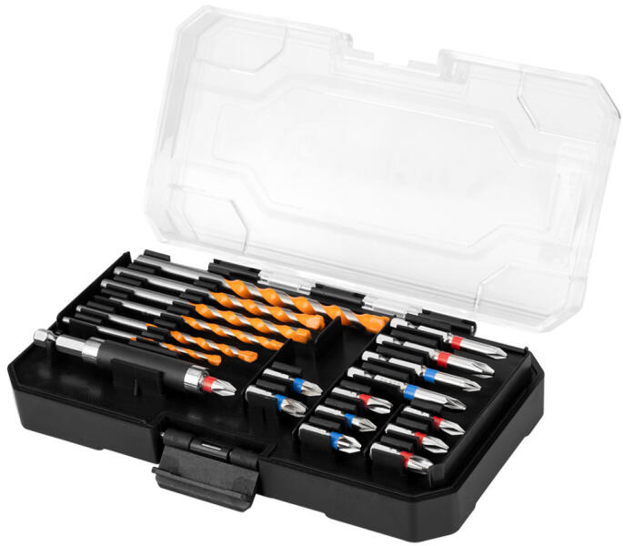 GRAPHITE 56H611 FÚRÓ-CSAVARBEHAJTÓ KÉSZLET, 20DB-OS. Egy többcélú szerszám- és tartozékkészlet, amelyet szakemberek és barkácsolók számára ajánlunk. Magas minőségű termékeket tartalmaz: 6 darab betonfúró fúrószárat: 25 mm-es fúrószerszámok: 4-5-5,5-6-7-7-8 mm; 9 db 25 mm: Ph1,2x Ph2, 2 x Ph3 , PZ1, 2xPZ2, PZ3; 4 db 50 mm : Ph1, Ph2, PZ1, PZ2 és egy bit tartó. Az alkatrészek robusztus s2 acélból készültek, ami garantálja a hosszú évekig tartó használatot.