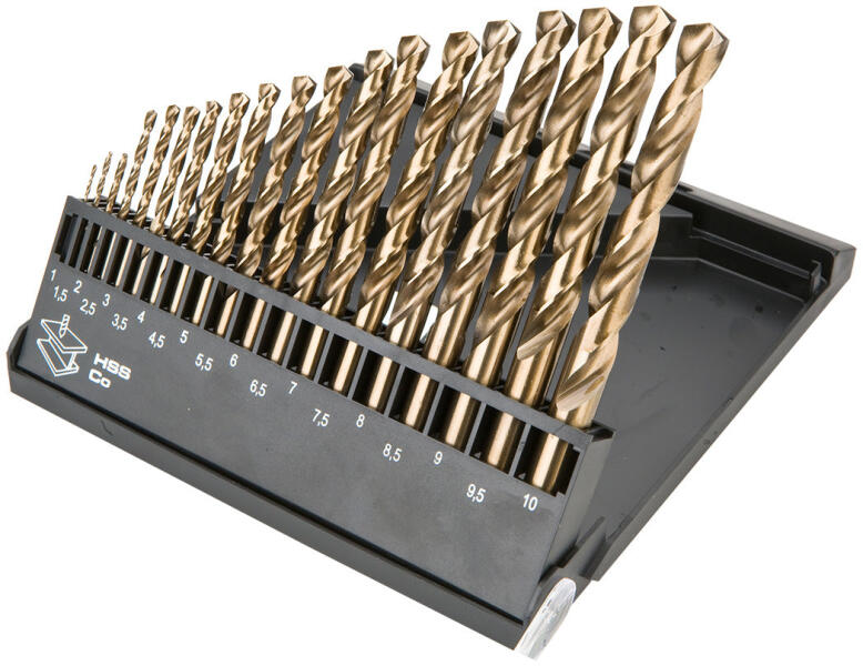 HSS-Co fém fúrószár, 1,0-10 mm, 19 db-os készlet, 1, 1,5, 2, 2,5, 3, 3,5, 4, 4,5, 5, 5,5, 6, 6,5, 7, 7,5, 8, 8,5, 9, 9,5, 10 mm, mélyen csiszolt, M35 acél, hegyszög 135°, nyíró-eltolás, DIN338