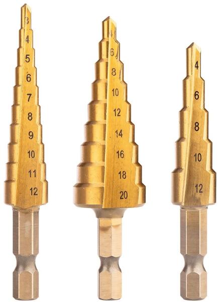 NEO 08-948 Lépcsős fúrókészlet, 3db-os, HSS-Titán, 3-20mm, hatszög szárral. A szerszámok ¼" hatszög szárral rendelkeznek. A fúrók átmérője a következő: 3-12 (lépcsők: 3, 4, 5, 6, 7, 8, 9, 10, 11, 12 mm), 4-12 mm (lépcsők: 4, 6, 8, 8, 10, 12 mm) és 4-20 mm (lépcsők: 4, 6, 8, 10, 12, 14, 16, 18, 20 mm). A fúrandó lemez vagy más anyag maximális vastagsága legfeljebb 4 mm lehet. Hasznosnak bizonyul a lemezmunkák, gépészeti végszerelések során.