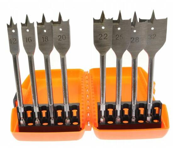 Megjegyzés: Ez a leírás automatikusan le lett fordítva magyarra. Lapos fúrószárak fához, készlet 8, 12-32 mm, Richmann Exclusive A készlet 8 db lapos fúrót tartalmaz fába fúráshoz és egy műanyag dobozt ezek szállításához és tárolásához. A készlet a következő méretű lapos fa fúrókat tartalmazza: 12, 16, 18, 20, 22, 25, 28, 32 mm. A fúrók akár 45 mm átmérőjű furatokhoz is sikeresen használhatók. Ezek a fúrók két egyenes pengéből állnak, és nem rendelkeznek forgácseltávolító hornyokkal. A fúrók hatszögletű farka megakadályozza azok elfordulását a tokmányban. Jellemzők: Fúrószár hossza: 150 mm Fúrófej illesztése: 1/4" Márka: Richmann Exclusive