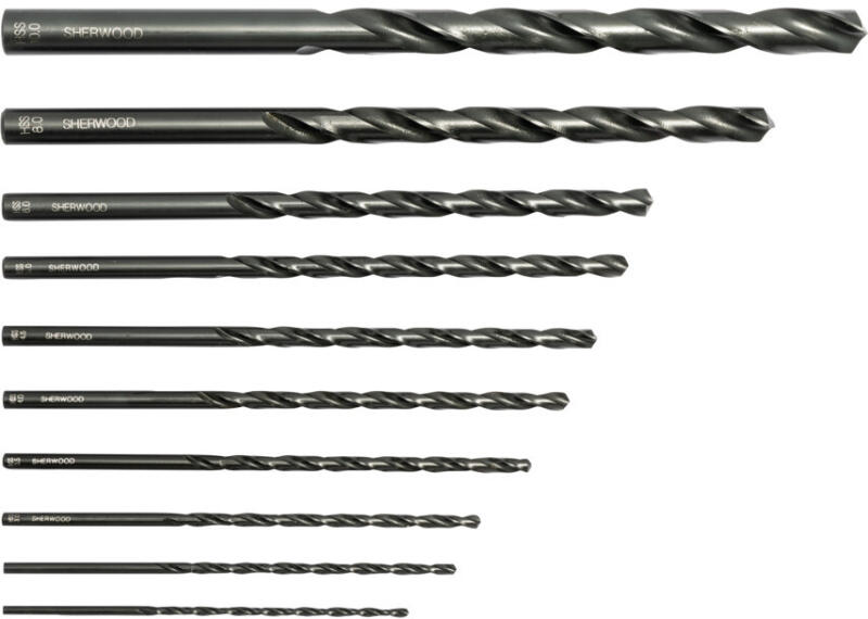 HSS hosszú fúrókészlet. Mély furatok kialakítására alkalmas a legtöbb anyagtípusnál Forgattyús tengelyek fúrására nem javasolt Gyártva a BS 328 Part 1 1986 szabvány el írásai szerint 10 darabos készlet Tartalma mm 2 0 x 85mm 2 5 x 95mm 3 0 x 100mm 3 5 x 112mm 4 0 x 119mm 4 5 x 126mm 5 0 x 132mm 6 0 x 139mm 8 0 x 165mm 10 0 x 184mm